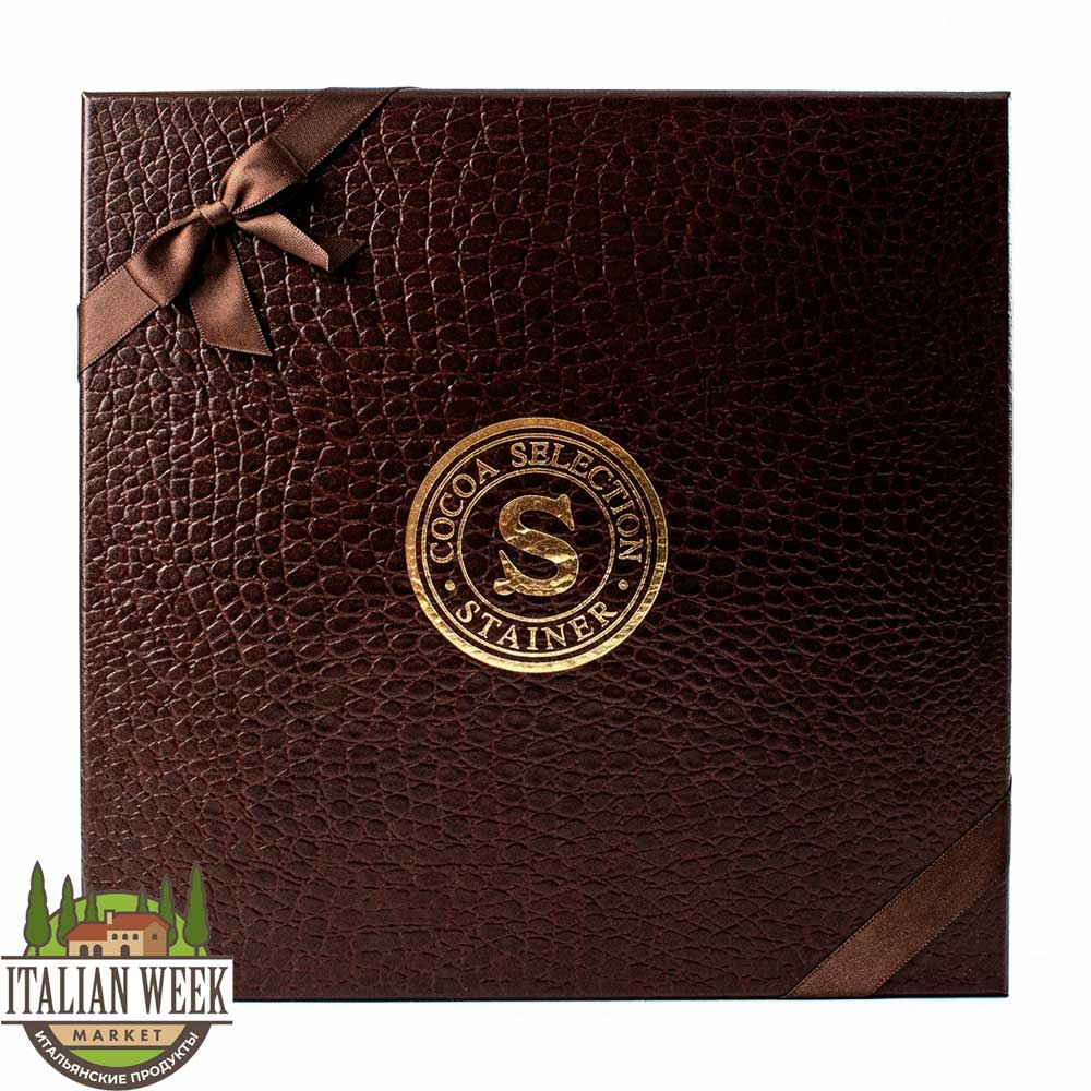 Состав: сахар, какао паста, какао масло, молоко цельное сухое и сливки молочные сухие, масла растительные (пальмовое, подсолнечное), грецкий орех, какао-порошок, фисташки, миндаль, кофейный порошок, лактоза, лимонная и мандариновая экссенция, эмульгатор: подсолнечный и соевый лецитин, зерна какао, регулятор кислотности: лимонная кислота, ароматизаторы: малина, сабайон, грецкий орех, миндаль, ром. Красители: карминовая пудра (Е120), свекольная пудра, турмериковая пудра (Е100), желтый гилро сафлор, зеленый краситель (Е133). Может содержать остатки других орехов и арахиса.