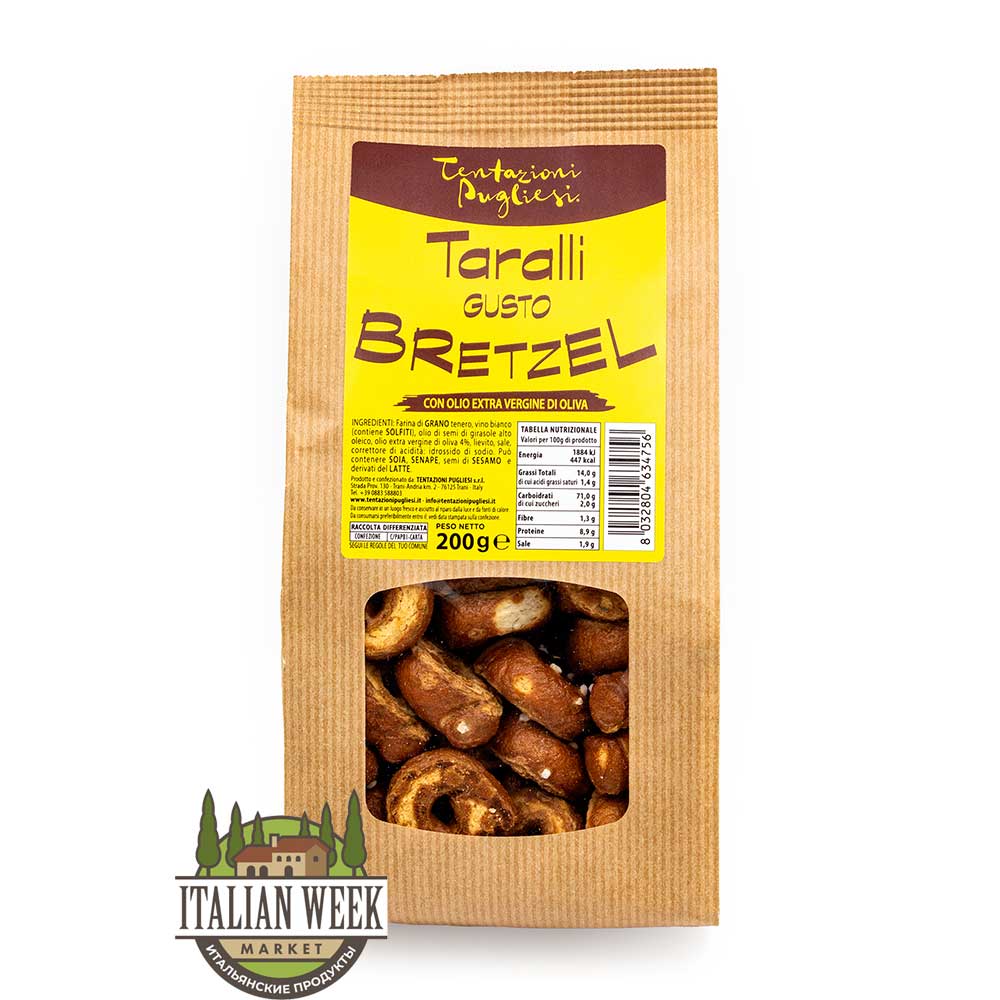Почувствуйте хруст Апулии! Это традиционные итальянские таралли, вдохновлённые знаменитым немецким брецелем. Идеально хрустящие, с характерной глянцевой корочкой, щедро посыпанные крупной солью, они сочетают в себе средиземноморскую форму с насыщенным солодово-сливочным вкусом северной Европы.